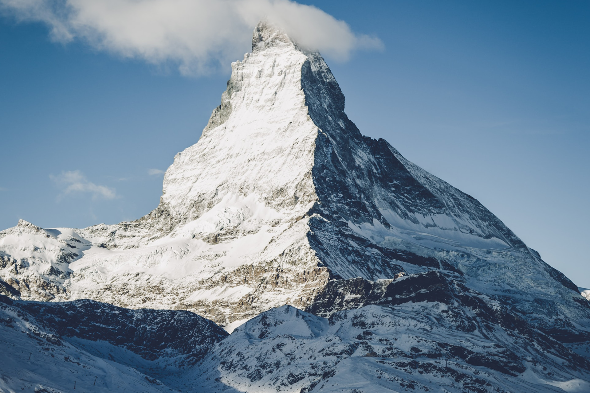 山岳写真でお馴染みマッターホルン。岩と雪が織りなすコントラストが美しい、アルプスの王者です。 -